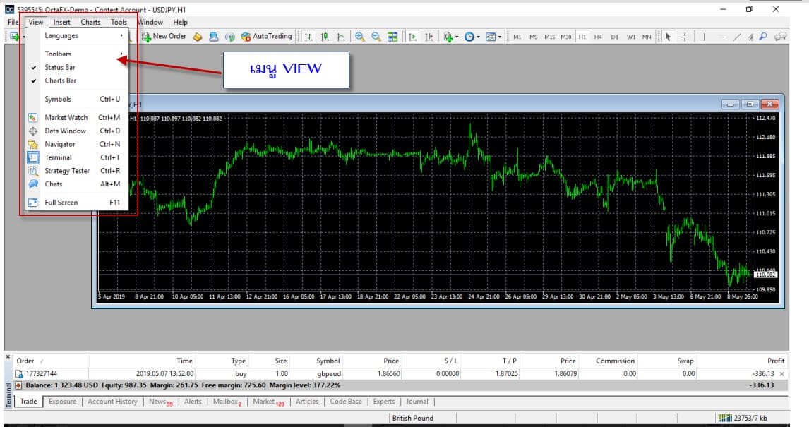 หน้าตายังไม่เป็นมิตรกับ เทรดเดอร์ขั้นเทพอย่างเราเลย ต้องมาปรับแต่งกันพอสมควรเลยหละ.. โดยเราจะเริ่มเมนูที่สอง คือ View ครับ ซึ่งเจ้า View ตัวนี้จะเป็นตัวตกแต่งหน้าตาของกราฟให้ดูดี มีระดับขึ้น