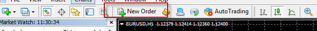 เราสามารถเปิด ออร์เดอร์การซื้อขาย ได้ 3 ที่ เหมือนกันกับ การเรียกใช้ Indicators เลยครับ .. ที่แรก เราเปิดได้คือ จาก Tools Bar โดยเราใช้ Mouse Double Click ที่ปุ่ม New Orderได้เลย