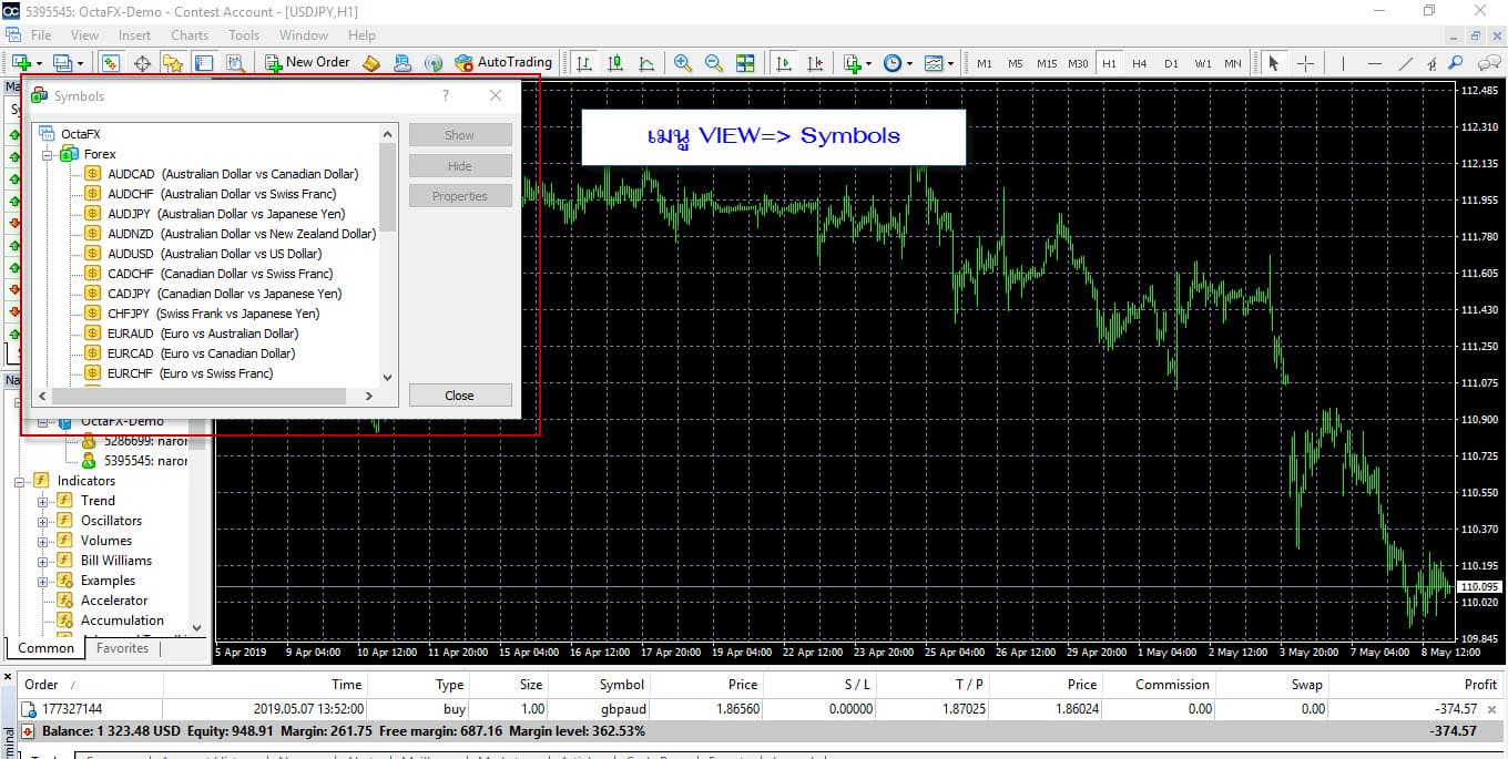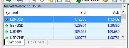 ที่ ต่อมาคือ เลือกจาก หน้าต่าง Market Watch โดยใช้ Mouse Double Click ตรงคู่เงินที่ต้องการได้เลย