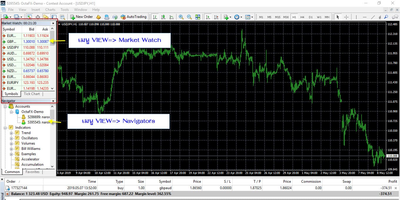 อธิบาย สั้น ๆ เกี่ยวกับ เมนู Maket Watch => แสดงค่าของคู่เงินในตลาด แบบ Realtime แบบ วิ่งกัน สดเลย ครับ นาทีชน นาที Key ลัด ( Ctrl+M ), เมนู Navigators => โชว์รายละเอียดของ Account ที่ Login เข้ามา, Indicators พื้นฐาน, EA(Expert Advisors), Custom Indicators และ Script Key ลัด ( Ctrl+N ) เมนูนี้ผมใช้ตลอดครับ ขาดไม่ได้ อีกเมนูของ View ที่ควรจะรู้ คือ View=> Symbol Key ลัด ( Ctrl+S ) ใช้บอกรายละเอียดของแต่ละคู่เงิน