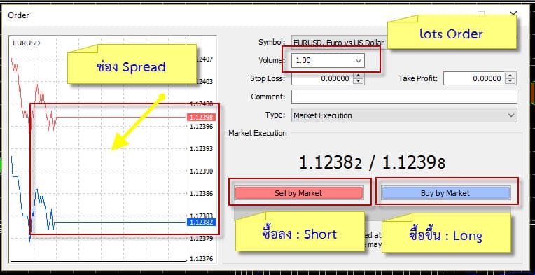 จากภาพ ครับ ตรงที่เราต้อง ระมัดระวังคือ Volume เพราะค่า Default จะตั้งเป็น 1.00 เสมอ หากเป็นบัญชี Cent ยังพอรอด แต่เป็น บัญชี STD หรือ Mini นี่ อันตรายมากครับ 1.00 หมายถึง 100$ ใน ออร์เดอร์ที่เรากดเปิด ล้างได้เลย นะ มาดูความหมายของแต่ละรายการกันเลย