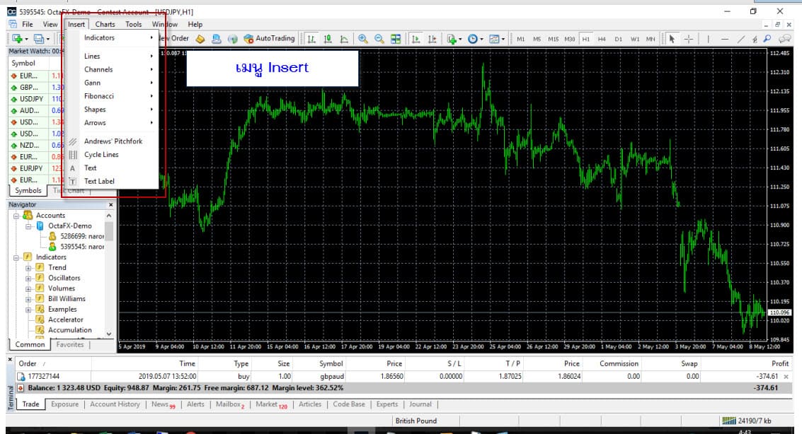 เมนูนี้ใช้งานในส่วน การแทรก การวาง เครื่องมือต่าง ๆ ลงบนกราฟ ไล่เรียงมาตั้งแต่ Indicators , Line , Channal , Gamm , Fibonacci , Shaps , Arrow , Andraw pitchfork , tex , label แต่ส่วนมาก มักจะใช้แค่ Indicators เพื่อสร้างเส้น EMA กัน หรือไม่ก็ ใช้กาง Fibo ไม่น่าเกินนั้นครับ