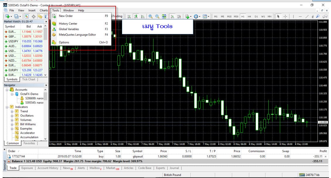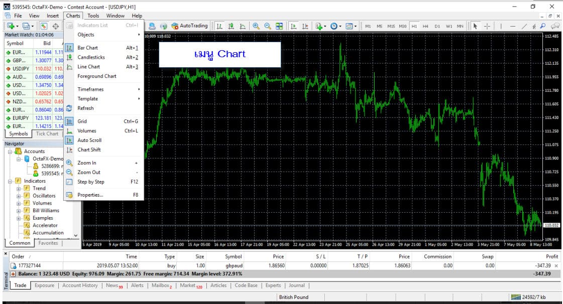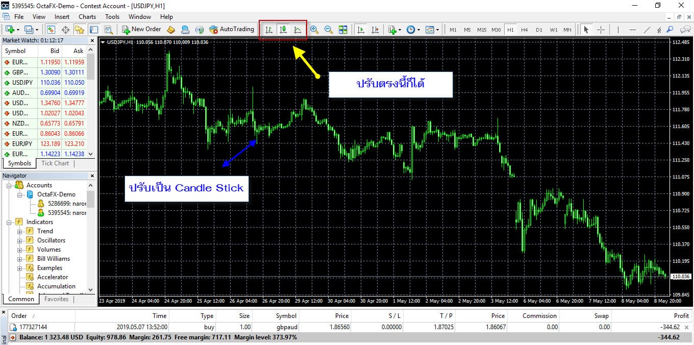ใช้ในการปรับแต่งกราฟ เพิ่มความสวยงาม ย่อ ขยาย เมนูที่ใช้บ่อย ๆ ประมาณนี้ครับ Bar Chart (Alt+1), Candlesticks Chart(Alt+2), Line Chart(Alt+3) ใครศึกษามาด้านไหนก็ใช้อย่างที่เราศึกษามา ที่เห็นใช้กันส่วนใหญ่จะเป็น Candlesticks Chart , Timeframes , Template ทีนี้เรามาปรับแต่งกราฟให้เป็น แบบ Candlesticks กัน