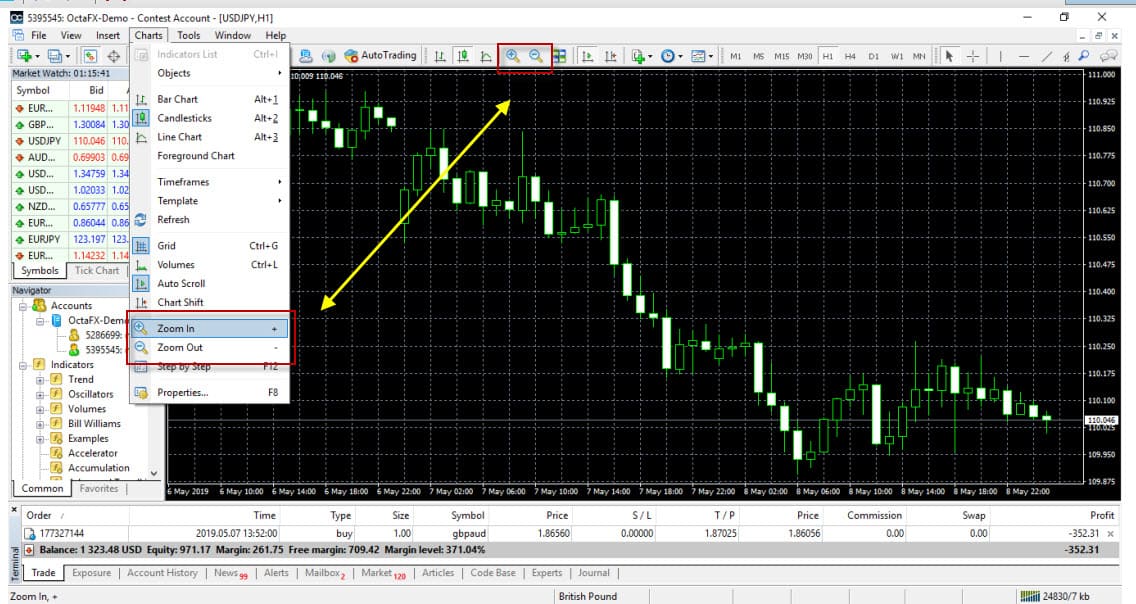 เมนู Zoom เราใช้ใด้ 2 ที่นะ จาก เมนู Chart และ Tools Bar ตามภาพ หลังจากขยายกราฟแล้ว สบายตาขึ้นเยอะเลย มาดูเมนูต่อไป กันครับ