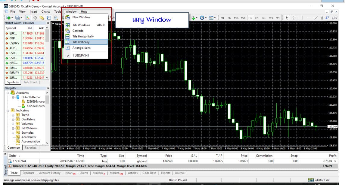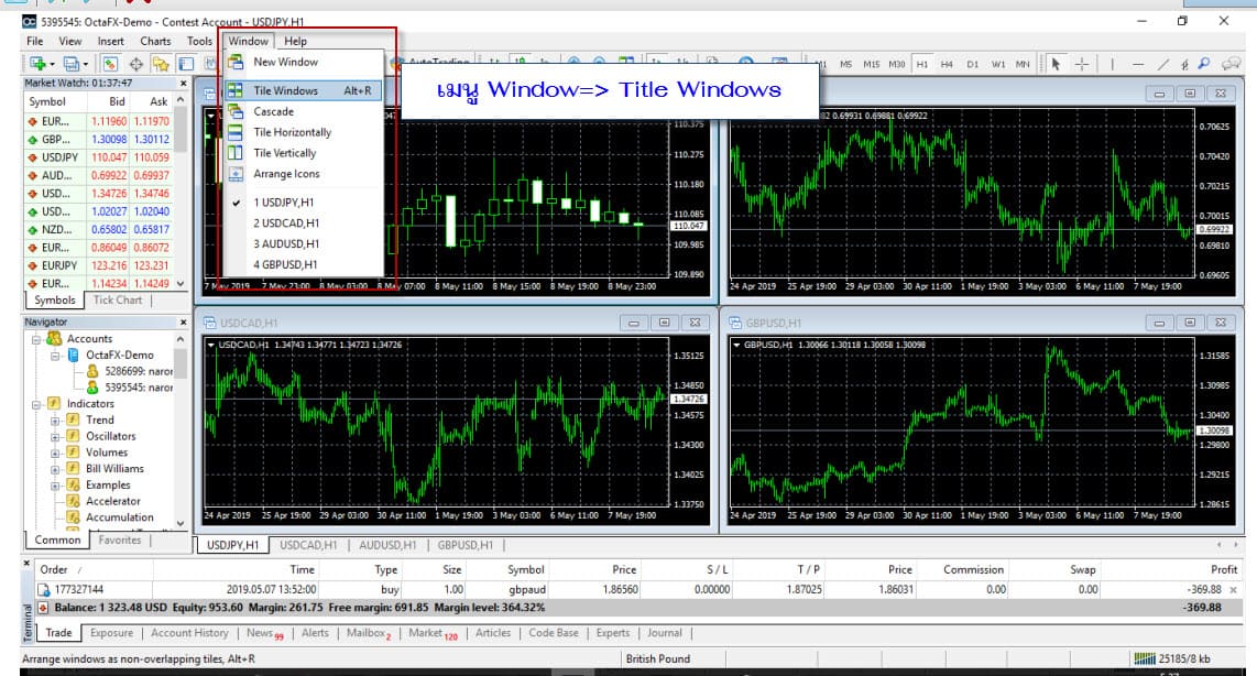 เมนูนี้ ใช้สำหรับวางกราฟ หรือเรียงกราฟในกรณีที่เราเปิดกราฟมากกว่า 3 คู่เงิน แต่จริง ๆ แล้ว ก็ไม่ค่อยได้กัน มาดูภาพ ประกอบกันครับ
