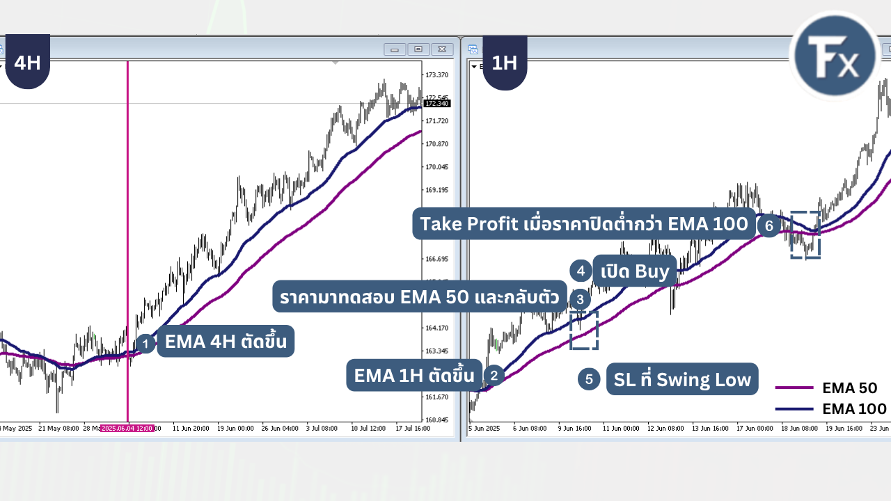 - เส้น EMA ตัดขึ้น ใน Time Frame เล็ก (TF 1H)