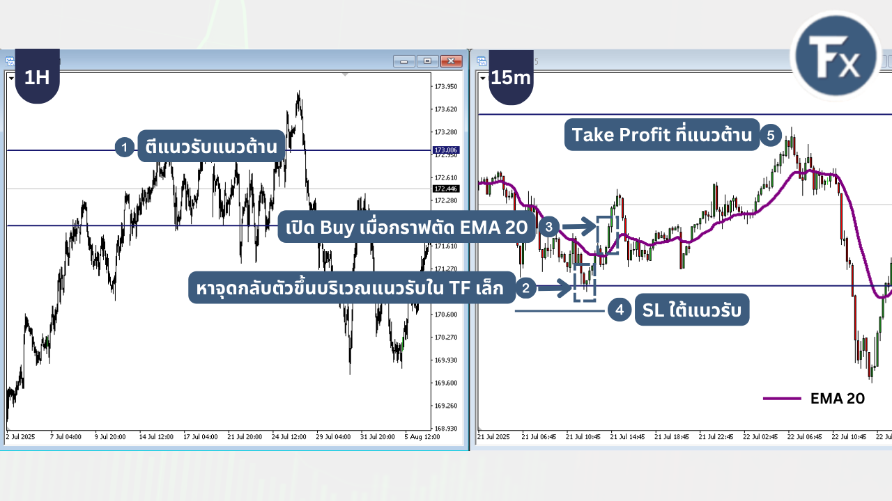 - รอราคาเกิดการกลับตัวใน Time Frame เล็กและเกิดการตัดลง EMA 20 (TF 1H)