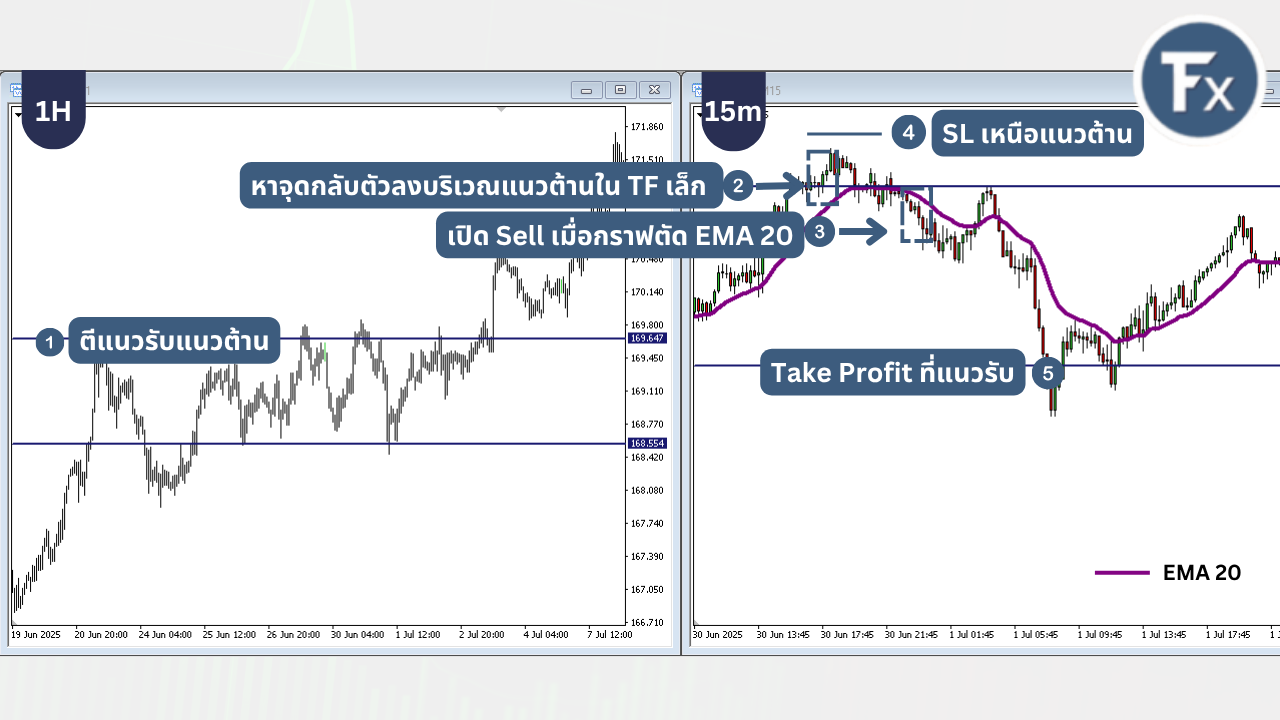 - เส้น EMA ตัดลง ใน Time Frame เล็ก (TF 1H)