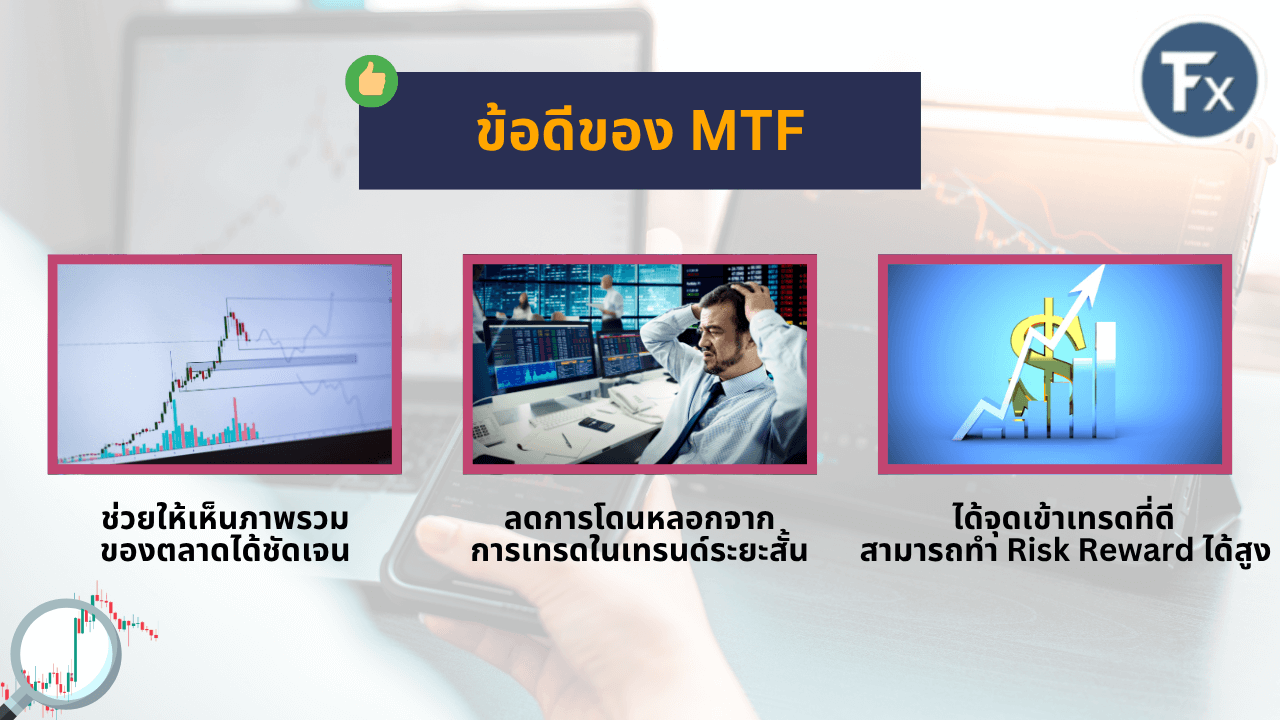 - ข้อดีของ Multi-Timeframe Analysis: คือ ช่วยทำให้เห็นภาพรวมของตลาดได้ชัดเจน, เพิ่มความแม่นยำในการเข้าเทรด รวมไปถึงเพิ่ม Risk Reward Ratio ให้กับกลยุทธ์การเทรดได้