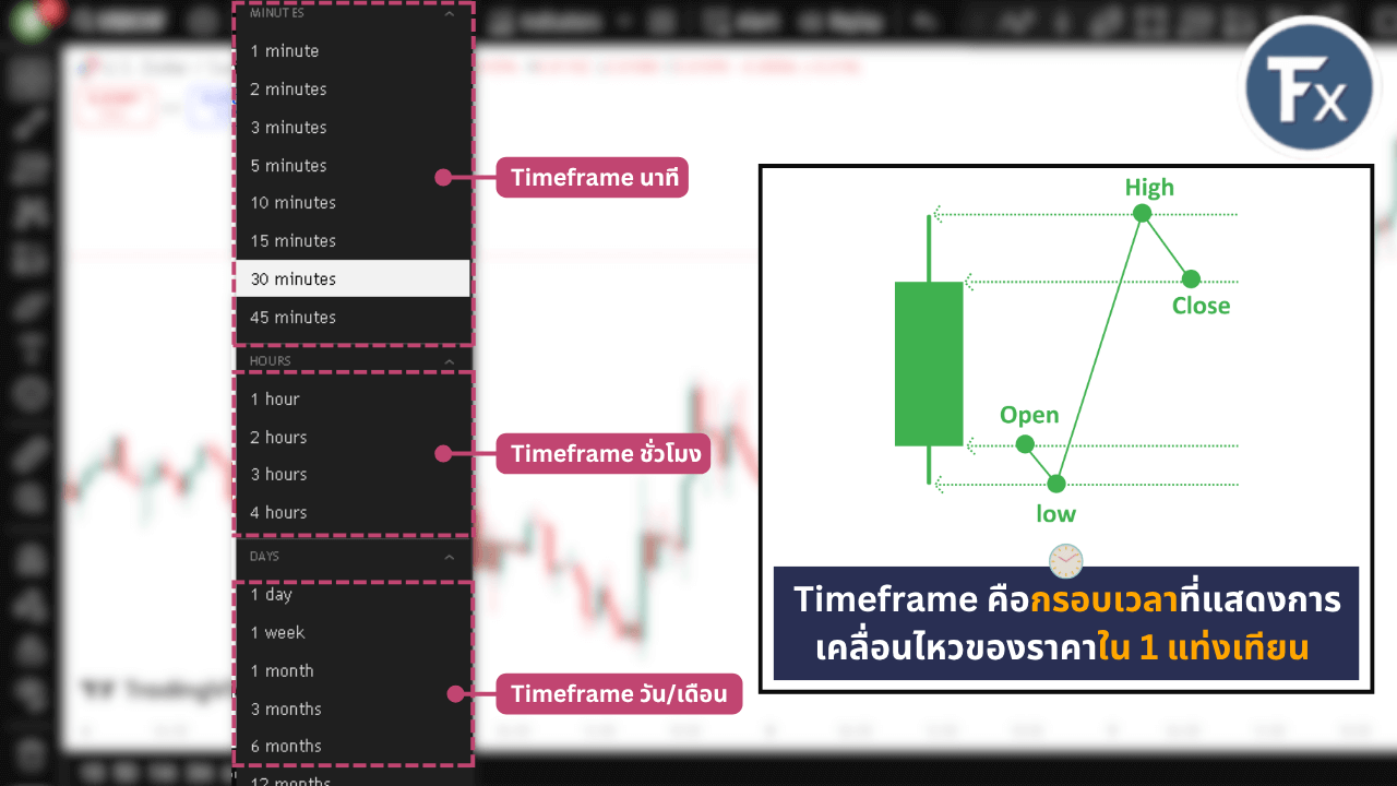 - Timeframe: คือ “กรอบเวลาการเคลื่อนไหวของราคาใน 1 แท่งเทียน” เริ่มต้นตั้งแต่หลักวินาทีจนถึงหลัก 1 เดือน ซึ่งมีส่วนสำคัญต่อสไตล์การเทรดและการวิเคราะห์ทางเทคนิคเป็นอย่างมาก