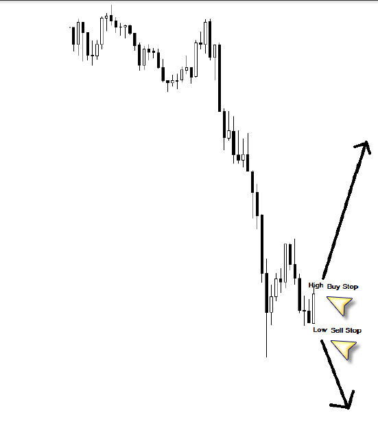 4.รอ Inside Bar แล้วตั้ง Pending ไว้ที่แท่ง Inside Bar (Inside Bar คือแท่งที่มีจุดสูงสุดต่ากว่าแท่งก่อนหน้านั้น และมีจุดต่าสุดสูงกว่าแท่งก่อนหน้านั้น ) วิธีการก็คือให้เราตั้ง Buy Stop ไว้ที่ High และ Sell Stop ไว้ที่ Low