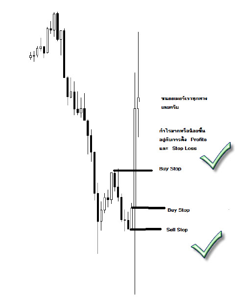 ให้เทียบเวลาที่ข่าวในปฏิทินจะออก กับช่วงเวลาที่เราจะเข้าออเดอร์ โดยใช้กรอบเวลา M1 หรือ M5โฟกัสมาที่ช่วงก่อนเวลาที่ข่าวจะออกชัก 2-3 นาที ณ ตอนนั้น แล้วใช้คำสั่ง Penidng Order วางคำสั่ง Buy Stop และ Sell Stop ดังนี้
