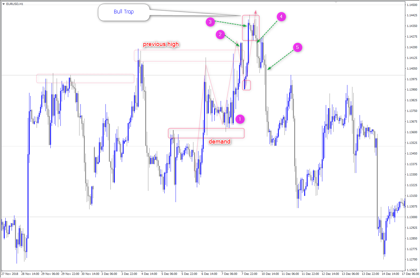 เลข 4 ราคากลับเทรนลงมา เทรดเดอร์พวกต่างๆ ที่เปิด long positions โดยเฉพาะที่ที่เลข 3 ที่ยังไม่ได้ปิดเพราะมั่นใจว่าราคาจะไปต่อกลายเป็นติดลบหรือเรียกว่า trapped traders ทันที ขณะที่ขาใหญ่เริ่มเปิด short positions เพราะได้เงื่อนไขเรื่องออเดอร์ เพราะขาใหญ่ต้องการเข้าเทรดเมื่อมีออเดอร์ฝั่งตรงข้ามมากพอกับจำนวนที่พวกเขาต้องการเปิดแต่ละครั้ง และเมื่อพวกเขาดันราคาไปทางที่พวกเขาเปิดเทรดแล้วมีเทรดเดอร์เกิดการสูญเสีย จะเห็นว่าพอราคามาเบรค previous high ล้วนมีแต่ทำให้เกิด buy market orders ทั้งจากรายย่อยที่ต้องการเข้าเทรดต่อหรือกลัวพลาดโอกาสอีก ทั้งจาก stop loss ของพวกเทรดเดอร์ที่เปิด short positions ตั้งแต่พื้นที่เลข 1 และทั้งจาก buy stop orders ที่ตั้งแถวๆ เหนือ พื้นที่ previous high ราคามาถึงพื้นที่นี้ ทำให้เงื่อนไขออเดอร์พวกนี้เกิดขึ้นมาทันทีเลยกลายเป็นพื้นที่ที่ขาใหญ่คาดหวังได้ว่าจะมี buy orders มากแถวไหนถ้าพวกเขาต้องการจะเปิด sell ดังนั้น Bull trap เป็นเรื่องจำเป็นเพราะเป็นส่วนหนึ่งในกลยุทธ์การเข้าเทรดของขาใหญ่เป็นเรื่องที่เกิดขึ้นปกติ เพราะขาใหญ่ไม่ว่าจะเข้าเทรดหรือจะออกเทรด ส่วนต้องการออเดอร์ตรงข้ามที่มากพอตรงจุดที่พวกเขาต้องการจะเข้าหรือจะออก