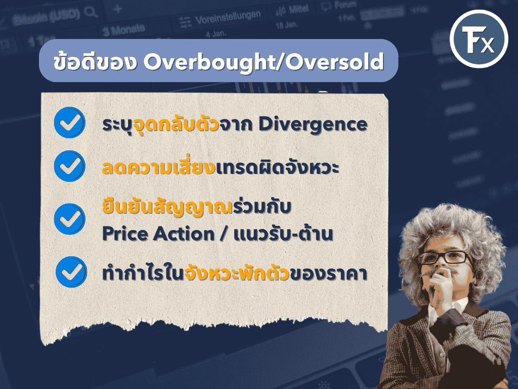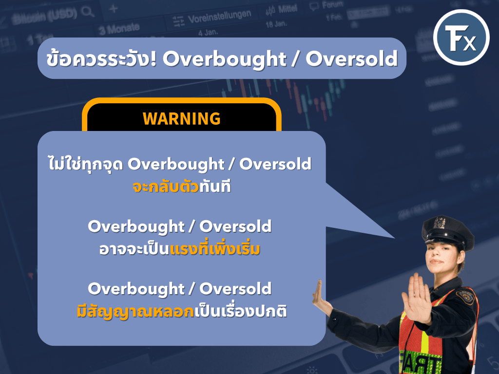 - ต้องระวัง! Overbought / Oversold ไม่ได้หมายความว่าจะกลับตัวทันที ราคาสามารถอยู่ในโซนนั้นได้ต่อเนื่องโดยเฉพาะในช่วงเทรนด์แรงหรือข่าวแรง เทรดเดอร์ควรพิจารณาปัจจัยอื่นร่วมด้วยก่อนตัดสินใจเทรด
