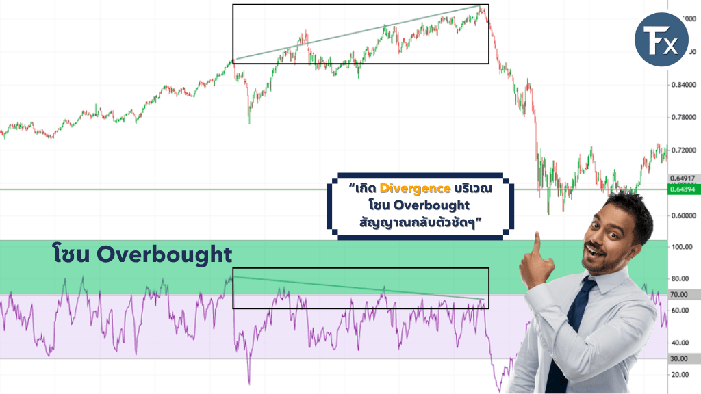 - ค่า RSI > 70 = อยู่ในภาวะ Overbought (ซื้อมากเกินไป)