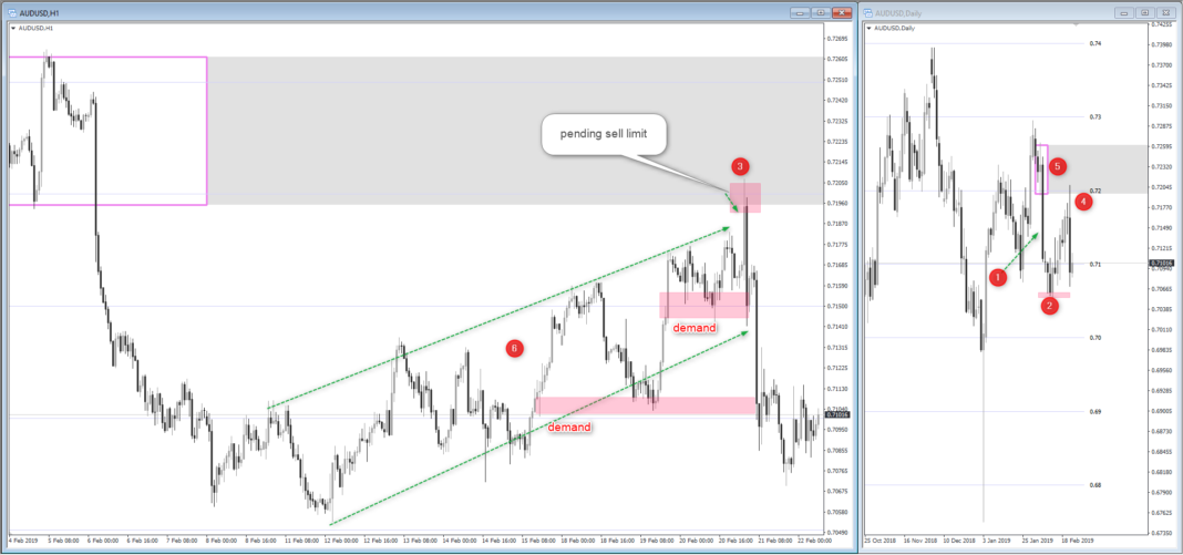 ชาร์ตด้านขวาเป็น D1 เริ่มด้วยเลข 1 จะราคาลงแรงบาร์ยาวๆ และชนะฝั่งตรงข้าม บอกว่าขาใหญ่เข้าเทรดเลยมี sell market orders เยอะและต่อเนื่อง เลข 2 เป็นการเช็ค risk:reward โดยเปรียบเทียบกับกรอบ base ของ supply ด้านบนและราคาวิ่งลงไปล่างสุดก่อนกลับมา สัดส่วนน่าจะได้ 1:3 ได้ เลข 3 เป็นการดูตำแหน่งที่จะเทรดว่าสัมพันธ์กับ big picture หรือเปล่า ในที่นี้คือชาร์ตขวามือคือชาร์ต D1 ที่เป็น supply ที่ต้องการหาโอกาสเข้าเทรด ถ้าเปิด sell ตรงนี้ก็จะสัมพันธ์กันพอดีไม่ได้เทรดสวนเทรน เลข 4 เป็นการกลับมาครั้งแรกของราคา ขาใหญ่เทรดไปครั้งแรกและชนะฝ่ายตรงข้ามด้วยจากข้อแรกที่เปิดเผย เป็นไปได้ว่าขาใหญ่จะเข้าเทรดอีก เทรดเดอร์อื่นๆ ที่รอก็เห็นก็เข้าเทรดอีก เทรดเดอร์พวกเทรดสวนขึ้นมาถ้าราคาไม่ไปต่อก็จะออกอีก คำสั่งพวกนี้ล้วนทำให้เกิด sell orders อีกรอบ เลข 5 ดูเวลาที่ base ของ supply จะเห็นว่า 2 บาร์ก่อนลง ใช้เวลาไม่นานเมื่อเทียบกับการลง เป็นการบอกได้ว่าความไม่สมดุลย์เกิดขึ้นจริง และสุดท้ายที่เลข 6 ที่ตีเป็น 2 เส้นคู่กันเพื่อดูว่าราคาวิ่งกลับมาอย่างไร จะเห็นว่าระยะห่าง demand 1 ก็ห่างพอที่จะสะสมกำไรได้ อาจเป็นการปิดบางส่วนถ้าเปิดเทรดลงไปเพราะ demand 1 ไม่มีโครงสร้างที่แข็งพอ ราคาอาจแค่หยุดพักสักระยะน่าจะลงไปต่อได้ ตรงแถว demand 2 น่าจะเป็นจุดทีพีที่ราคาวิ่งไปได้
