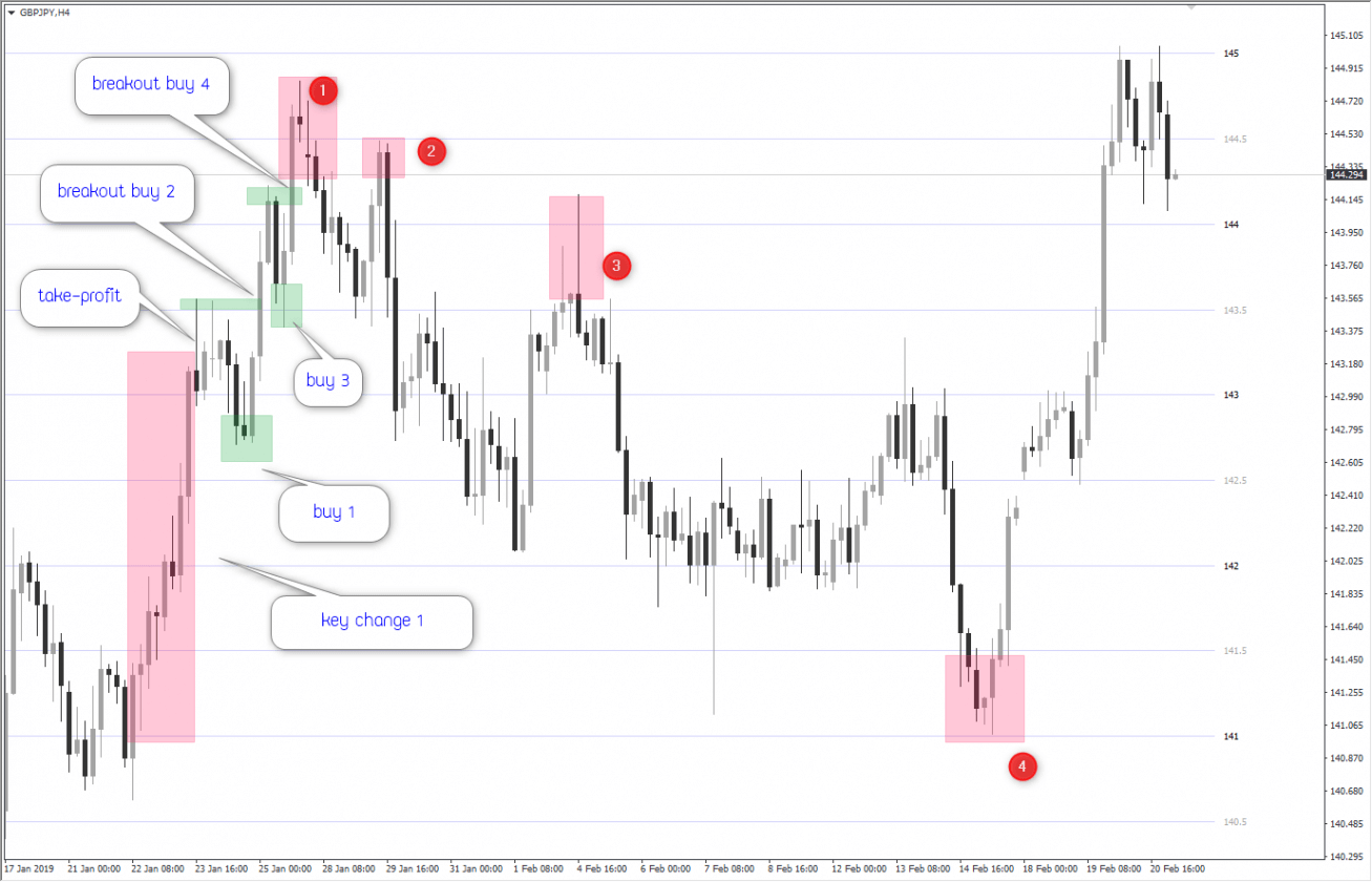 เริ่มที่ key change 1 ผลจากที่ขาใหญ่เข้าเทรด จะเห็นว่าราคาเบรค supply ตรงข้ามและขึ้นอย่างเดียว จุดนี้ทำให้รายย่อยมองหาโอกาสบายเป็นหลัก เทรดเดอรต่างประเภทก็ต่างกันออกไป เป็นรายย่อยบางกลุ่มก็จะใช้ Fibonacci Retracement มุมมองแรกของขาใหญ่ที่ต้องการคือหลังจากเปิด buy ที่ทำให้เกิด key change 1 อยากให้มีเทรดเดอร์เปิดตาม เพราะการเปิดตามทิศทางที่พวกเขาเทรดเปิดโอกาสให้พวกเขาปิดกำไรสะสมได้ แล้วราคาย่อตัวมาที่ buy 1 เป็นจุดที่รายย่อยเริ่มมองหาโอกาสเปิดเทรดเพราะร่องรอยเปิดเผย – รายย่อยต้องการหาร่อยรอยเพื่อเทรดตามขาใหญ่ และขาใหญ่ต้องการให้รายย่อยเปิดตามทิศทางที่พวกเขาเข้าเทรดด้านล่างเพื่อจะทำกำไรมากขึ้น – ไม่จะเข้าเทรดหรือออกจากตลาด เพราะขาใหญ่เทรดด้วยวอลลูมที่เยอะพวกเขาจึงต้องการออเดอร์ตรงข้ามที่เยอะพอที่พวกเขาจะทำอะไรได้ อย่างที่เกิดขึ้นช่วงแรก take-profit ที่ทำได้เพราะ buy orders ที่มาจากรายย่อยและมาจาก stop loss ของพวกเทรดเดอร์เปิด sell ในพื้นที่ทางช้ายมือ