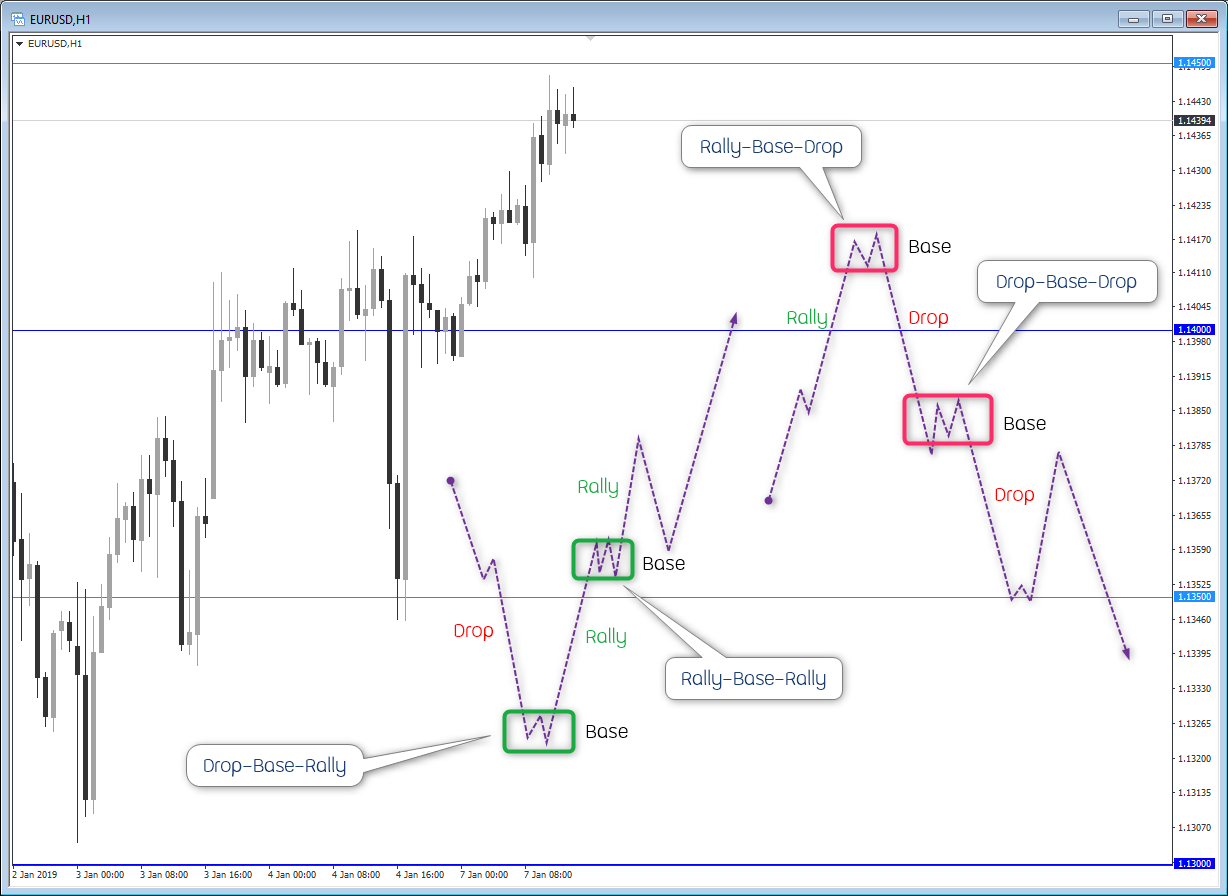 หลักการของ Supply/Demand  ดูลักษณะความไม่สมดุลที่เกิด ที่เป็น market orders ที่เข้ามามากและต่อเนื่องช่วงนั้น ถ้าดูจากแท่งเทียนประกอบจะเห็นแท่งเทียนที่ยาวๆ ไม่กี่แท่ง หรือใช้เวลาไม่นานในการสร้างความไม่สมดุลย์  เราก็มองไปที่ต้นตอ หรือพื้นที่ราคาสู้กัน หรือ Base ก่อนเกิด ความไม่สมดุลย์ พื้นที่ Base ก็สำคัญถ้าจำนวน Market orders ที่เข้ามาเยอะ เกิน Limit orders หลายเท่า เราก็จะเห็นพื่นที่ Base จำนวนบาร์น้อย  เราก็จะได้ต้นตอ หรือจุดอ้างอิงการหาโอกาสเทรด Supply/Demand เมื่อราคากลับมาพื้นที่นั้นอีกรอบ เพราะเมื่อความไม่สมดุลย์เกิดขึ้น ข้อมูลในการวิเคระห์ของเทรดเดอร์เพื่อรอเข้าตลาดเปลี่ยนไป และพวกที่เข้าเทรดตอนความไม่สมดุลย์และราคาได้วิ่งสวนกับทางคาดการณ์มาระยะหนึ่ง (trapped traders)  แบกรับความกดดันเพราะติดลบ พอราคากลับมาที่เดิมอีกรอบ ถ้าข้อมูลที่เปิดเผยจากการโต้ตอบของราคา ไม่เป็นอย่างที่พวกเขาคาดการณ์  เทรดเดอร์ (trapped traders) ที่ติดลบพวกนี้ก็จะเริ่มออกจากตลาดเป็นหลัก เพราะไม่อยากติดลบอีก หรือปิดเสียให้น้อยที่สุด   1. การกระทำแบบนี้ของพวก trapped traders ก็จะป้อนออเดอรตรงข้ามที่เขาติดลบเข้าตลาดมาอย่างต่อเนื่อง ถ้าจำนวนออเดอร์พวกนี้เยอะ ออเดอร์ที่เกิดจากการออกจากตลาดก็จะเข้ามาเยอะ 2. กลุ่มที่เห็น Demand/Supply เกิดขึ้นแล้ว รอเทรดเมื่อราคากลับมาก็จะได้โอกาสเข้าเทรด และ 3. ออเดอร์ขาใหญ่ที่ต้องการเปิดเพิ่มอีก ออเดอร์ที่มาจากเหตผลเหล่านี้ก็จะทำให้ราคาเด้งจาก Supply/Demand ได้เร็ว