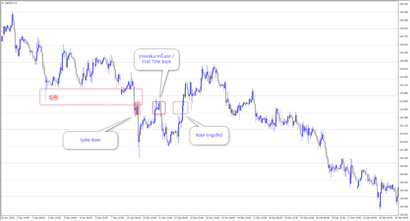 เมื่อมองจาก price chart จะเห็นตัวประกอบแบบภาพด้านบนคือ support/resistance หรือ supply/demand ที่ราคา spike หรือทำ pole แล้วเอาชนะไปได้ปิดล่าง ราคาย่องตัวกลับมาทำ Base/Flag เกิดขึ้นไปแล้วต่อทางที่เทรดเลยทำให้เกิด demand/supply ใหม่เกิดขึ้นตรงนั้น หรือเรื่องออเดอร์บอกว่าหลังจากขาใหญ่เข้าเทรดเพื่อเอาชนะปิดทำกำไรแล้วขาใหญ่ตัดสินในเปิดเทรดต่อ ณ ตรงพื้นที่นั้น ดังนั้นการรอเทรดตอนราคากลับมาพื้นที่ demand/supply ใหม่ที่พื้นที่เกิด ย่อมมี unfilled orders เหลืออยู่และมีเทรดเดอร์ที่เห็นอีกเพิ่ม limit orders เข้าไปตรงพื้นที่ๆ นั้นหรือขาใหญ่เปิดออเดอร์เพิ่มอีก เป็นหลักการเข้าเทรดทั่วไปแค่เป็น pattern ที่มักจะเกิดขึ้นหลังจากราคา spike หรือทำ pole ราคาจะกลับมาทางที่เกิด spike base ได้ก็ต่อเมื่อราคาได้ engulf พื้นที่ (engulf พื้นที่คือการที่ราคาสามารถเอาชนะพื้นที่ตรงนั้นได้ด้วยการปิดบนหรือปิดล่าง ยิ่งลักษณะที่ engulf เกิดขึ้นด้วยบาร์ยาวๆ ยิ่งดี เพราะบอกว่ามีการเข้าเทรดเพื่ออยากเอาชนะ อาจมองเป็น impulsive move ได้)