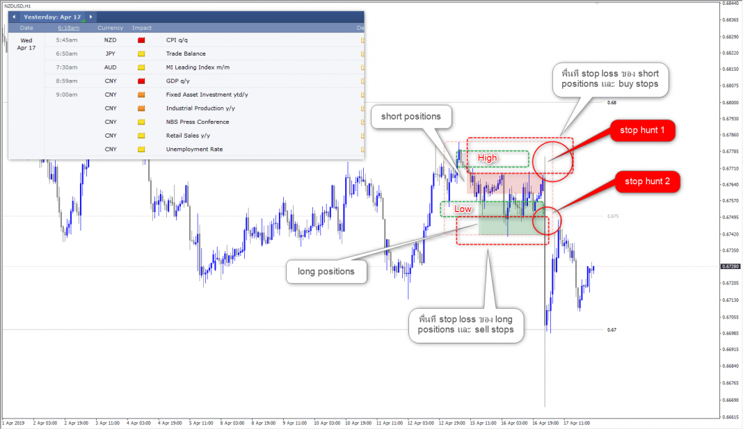 Stop loss ออเดอร์อยู่ตรงไหน เมื่อกล่าวทั่วไปที่ไหนมี positions ถ้าเป็นเทรดเดอร์ที่มีวินัยหรือรับความเสี่ยงบื้องต้นได้ ก็จะมีการกำหนด stop loss เบื้องต้นไปแต่ละ position ที่เปิดเข้าไปในตลาด หลักการตั้ง stop loss ทั่วๆ ไปก็จะเป็นใต้ swing low เล็กน้อยหรือเหนือกว่า swing high เล็กน้อย หรือต่ำกว่า demand และสูงกว่า supply หรือต่ำกว่า support และสูงกว่า resistance เล็กน้อย เมื่อเกิดพื้นที่สะสมออเดอร์หรือช่วง accumulation บอกให้รู้ว่า open positions อยู่ตรงไหนมาก ดังนั้นพื้นที่เป็น accumulation ส่วนมากก็จะเป็นเป้าสำหรับ stop hunting