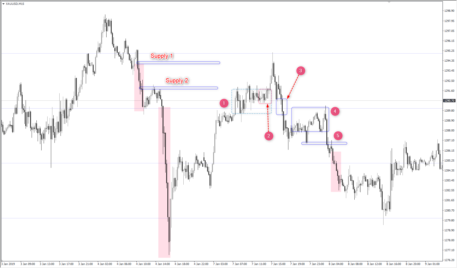 ชาร์ตราคาลงมา ยืนยัน supply 1 และ supply 2 แล้วราคาเด้งกลับขึ้นมา ยกตัวอย่างเช่น ตอนนี้ราคาล่าสุดอยู่ในกรอบสีแดงเลข 2 ไม่ไปไหนหลังจาก sideway มาสักระยะเป็นหลัก ตรงพื่นที่ sideway เลข 1 ก็จะมี open positions ทั้ง buy และ sell อยู่ในตลาด ความรู้ทั่วไปในการเทรดคือ จากจุดนี้ถ้าท่านเข้าใจตลาดและออเดอร์ทำงานอย่างไรและเทรดเดอร์ เทรดอย่างไร ท่านก็จะวิเคราะห์ได้ว่า
