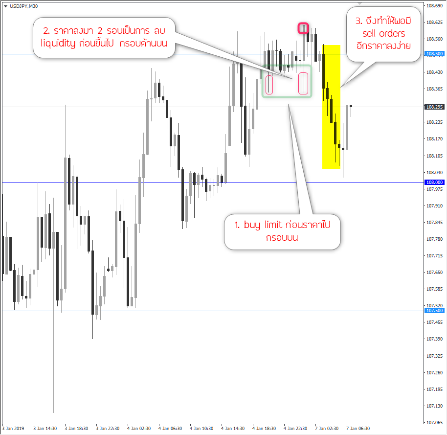 เราถูกสอนว่า ตรงพื้นที่ Support/Resistance นั้นๆ จะแข็ง การโต้ตอบน่าจะเป็นแบบเดิมอีก จนกว่า Support/Resistance จะโดน break จากความรู้พวกนี้เลยทำให้เทรดเดอร์ที่รอเข้าตลาด เมื่อเห็นราคาจะไปหาจุดที่ Support/Resistance ที่วิเคระห์ว่าแข็งพอ ก็จะเริ่มวาง Limit orders บริเวณพื้นที่ นั้นๆ