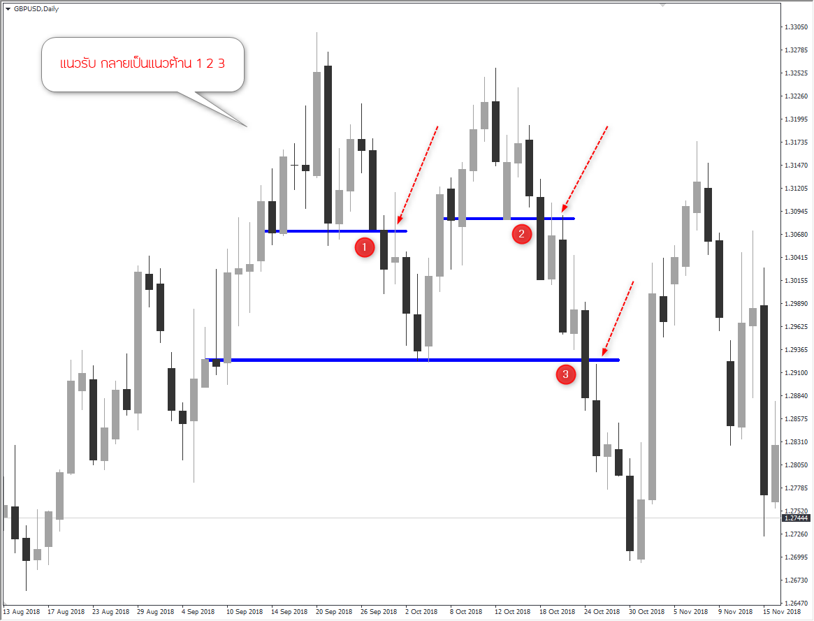 แนวรับกลายเป็นแนวต้าน หรือ แนวต้านกลายเป็นแนวรับ ก็เป็นจุดที่ทำงานเร็วเพราะหลักการ ออร์เดอร์ทำให้เทรดเดอร์อยู่ในตลาด พื้นที่นั้นๆ เยอะ ถ้าลักษณะการเปลี่ยนข้างแนวรับ-แนวต้าน สร้างความกดดันให้เทรดเดอร อยู่ในตลาดพื้นที่นั้นๆ เยอะ เช่น การที่ราคาเบรกพื้นที่แบบเร็วและแรง ตามด้วยการปิดราคาด้วย ข้อมูลพวกนี้สำคัญมากเพราะทำให้ข้อมูลที่จะวิเคราะห์การเทรด หรือการถือรอ ของนักเทรดเปลี่ยนไป