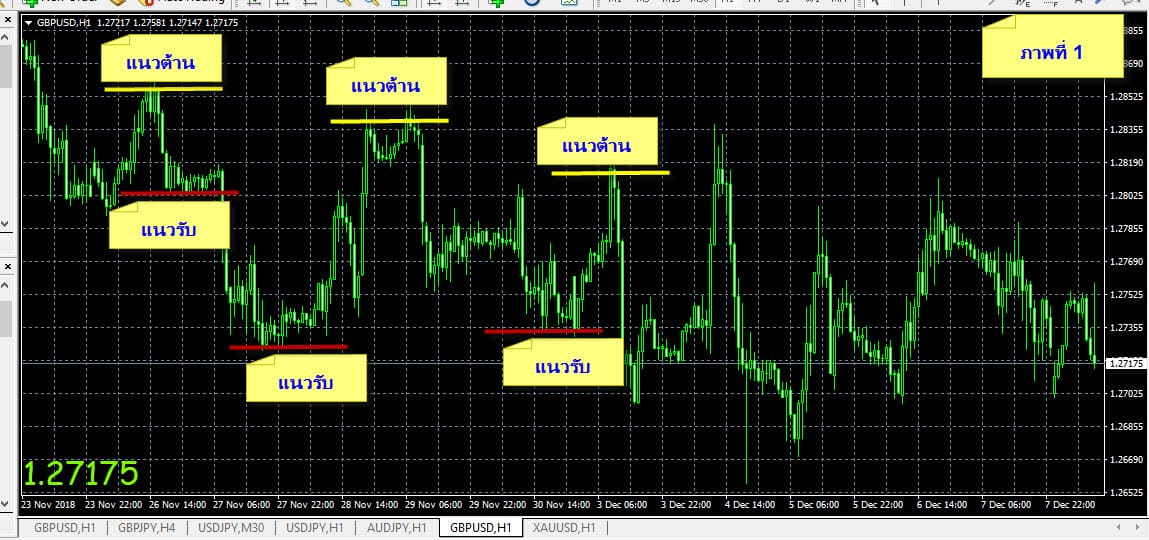 ภาพที่ 1 กราฟ 1 hr GBP/USD แสดง แนวต้าน แนวรับ จาก กราฟในตลาดจริง