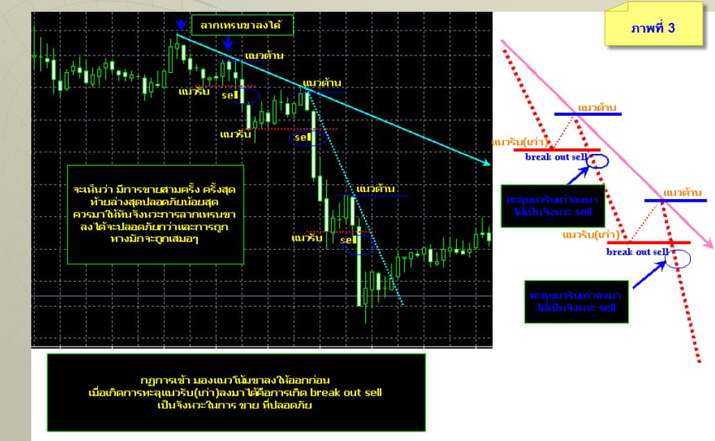 - การหาจุดเข้าซื้อ ขาย โดยการใช้ แนวรับ แนวต้าน เข้ามาช่วย เมื่อทะลุ แนวต้านขึ้นไปได้ เรียกว่า break out ซื้อ เมื่อทะลุ แนวรับลงมาไปได้ เรียกว่า break out ขาย หลังจากที่รู้การลากเส้นแนวโน้มไปแล้วเราจะเอาการลากเส้นแนวโน้มมาผสมกับการหาจังหวะเข้าซื้อ ขายที่ปลอดภัย