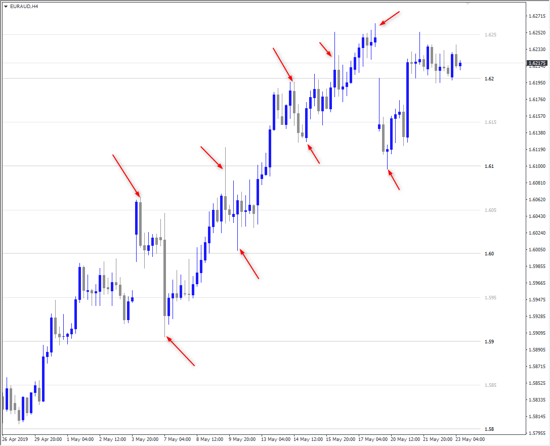 ทำไมเบรค swing high สำคัญ เพราะการเบรคบอกว่ายังมีเทรดเดอร์อยากเทรดต่อโดยเฉพาะขาใหญ่อยากดันราคาไปทางเทรนนั้นๆ ต่อ ถ้ามองไม่ออกย้อนกลับมาจุดที่เกิด swing high ก็เกิดการเบรค ดังนั้นเรื่อง swing high/swing low จึงสำคัญต่อการกำหนดเทรนและหาจุดเข้าเทรด อย่างที่ยกตัวอย่างมาเป็นการทำเทรนขาขึ้น สิ่งที่ต้องเห็นคือ ต้องเห็นเมื่อราคาทำ swing low แล้วราคายังต้องเบรค swing high ก่อนขึ้นไปได้ด้วย และเมื่อ swing high ใหม่เกิดขึ้นราคาย่อตัวลงมา swing low ใหม่ที่จะเกิดตามมาไม่ครวจะต่ำกว่า swing low ก่อน ส่วนมากจะอยู่ที่จุดราคาเบรค swing high ตัวก่อนขึ้นไป แต่เมื่อราคาเบรค swing low ได้แบบตามรูปสุดท้ายบอกว่าราคาจะเริ่มเปลี่ยนเทรน เพราะ impulsive move เปลี่ยนข้างก็ประยุกต์หลักการเดียวกันแต่ฝั่งตรงข้ามเท่านั้นเอง
