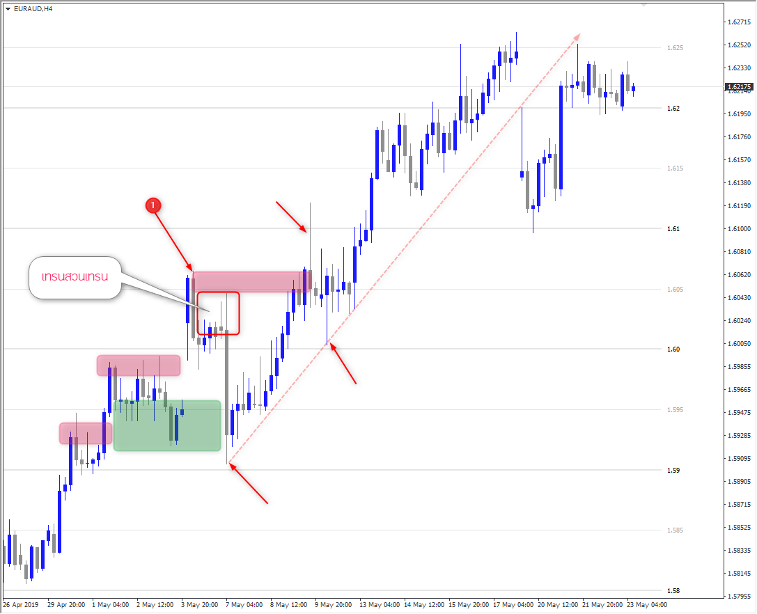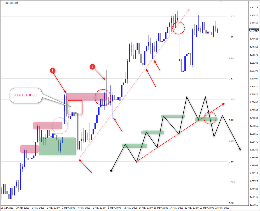 คำถามแรกคือ ทำไมราคาเกิดขึ้นไปทำ swing high ได้เพราะอะไร – เพราะมีการเข้าเทรดที่กรอบสีเขียว และเป็นการพยายามดันราคาไปต่อ เลยเอาชนะกรอบสีแดง 2 กรอบลัวดันราคาขึ้นไปทำ new high เลยทำให้เกิดเป็น swing high ได้