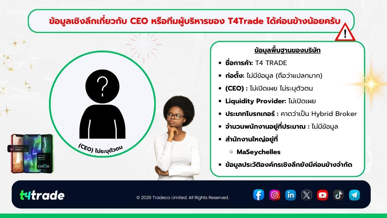 • ในส่วนของข้อมูลผู้บริหาร ต้องบอกตามตรงว่าผมหาข้อมูลเชิงลึกเกี่ยวกับ CEO หรือทีมผู้บริหารของ T4Trade ได้ค่อนข้างน้อยครับ