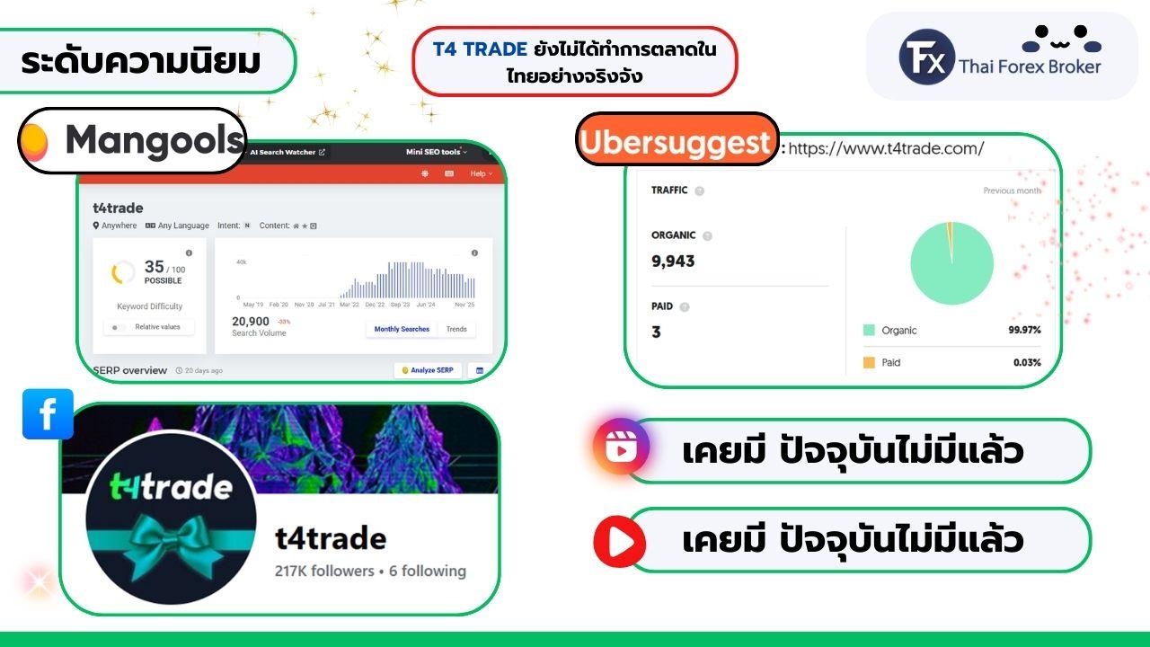 • ถ้ามาดูในฝั่งของประเทศไทย ต้องบอกว่าระดับการรับรู้ของ T4Trade ยังอยู่ในช่วงเริ่มต้นครับ ยังไม่ได้เป็นชื่อที่นักเทรดไทยพูดถึงกันมากเท่าโบรกเกอร์เจ้าหลัก ๆ ในตลาดครับ