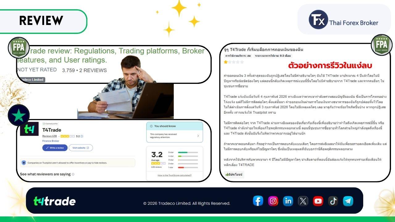 • อีกเว็บไซต์ที่นักเทรดนิยมใช้ดูรีวิวโบรกเกอร์คือ Forex Peace Army (FPA) สำหรับ T4Trade บนเว็บไซต์นี้มีคะแนนรีวิวเฉลี่ยอยู่ที่ประมาณ 76 คะแนนจาก 5 คะแนน ครับ