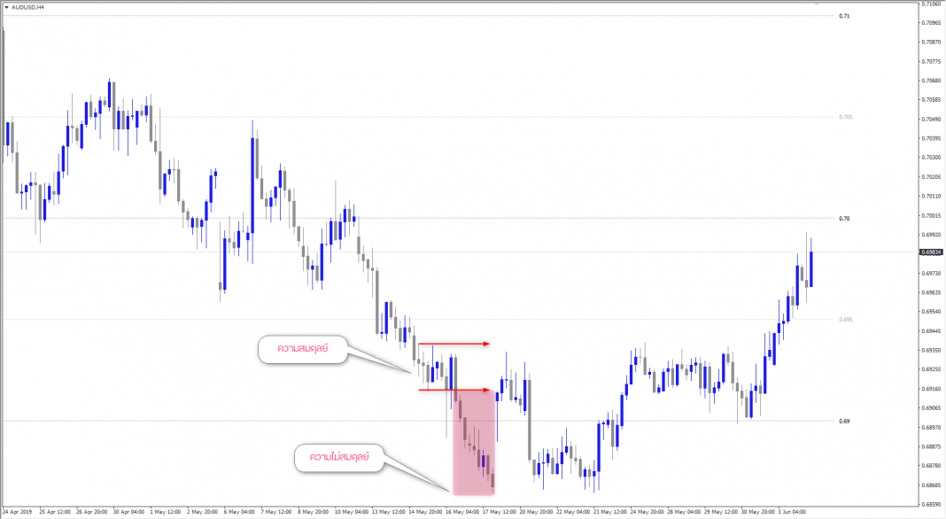 ยกตัวอย่างด้านบน เรากำหนด supply/demand เพราะเกิดความไม่สมดุลย์ระหว่างออเดอร์ที่มาจาก sellers และ buyers เปิดเผยออกมา ความไม่สมดุลย์เป็นตัวยืนยันว่าฝ่ายไหนชนะ ค่อยบอกได้ว่าเป็นพื้นที่ demand หรือ supply อย่างด้านบนความไม่สมดุลย์ลงมาบอกว่า sell orders เป็นฝ่ายชนะหรือเกิน buy orders นั้นบอกว่ามีแต่เทรดเดอร์เปิดเทรด sell ตรงพื้นที่ความสมดุลย์จนออเดอร์ทาง buy สุดท้ายพื้นที่นั้นหมด เมื่อ sell orders ไม่มีออเดอร์ฝ่ายตรงข้ามจับคู่เลยต้องดันราคาลงมาเพื่อไปหาออเดอร์ฝ่ายตรงข้ามที่ราคาต่อไป (ออเดอร์ที่รอที่ราคาถัดไปเป็น limit orders) ถ้าราคาลงมาออเดอร์ฝ่ายตรงข้ามน้อยมากและไม่เพียงพอ ก็ยิ่งจะทำให้ราคาไปหาออเดอร์ฝ่ายตรงข้ามที่ราคาต่อไปเร็ว เลยทำให้เกิดความไม่สมดุลย์เกิดขึ้น ดังนั้นเมื่อเปิดเทรด market orders ก็จะจับคู่กับ Limit orders ที่รอที่ราคานั้นๆ ถ้า Limit orders ที่ราคานั้นๆ ไม่พอ market orders ก็จะเกินไปทาง market orders และไปหา limit orders ที่ราคาต่อไป