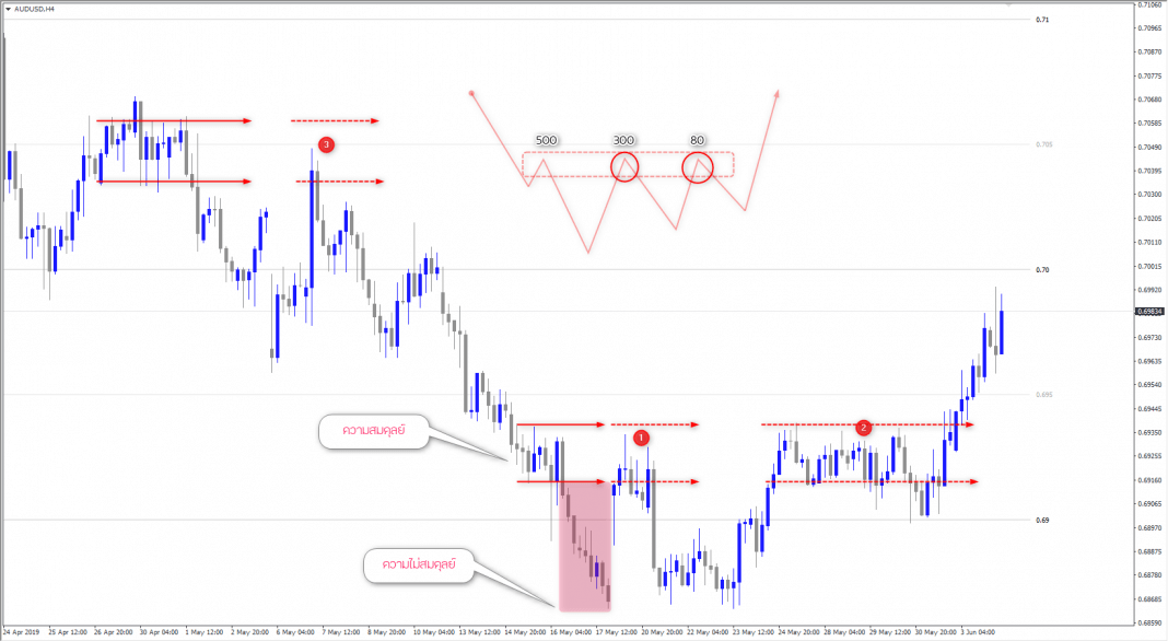 เมื่อมองมุมออเดอร์ประกอบ กรอบที่บอกความสมดุลย์คือพื้นที่ที่ market orders เปิดเทรดกับ limit orders ที่พื้นที่ราคานั้นๆ และจำนวน market orders ไม่ได้เกินกันมามากนิดหน่อยแค่อยู่ในกรอบ trading transaction เกิดขึ้นได้เมื่อ market order ได้ match-and-fill กับ limit order ที่ราคานั้นๆ ดังนั้นมองมุม order flow จึงบอกว่า limit orders เพิ่ม Liquidity เข้าตลาดรอให้ market orders มาจับคู่ที่ราคานั้นๆ ส่วน market orders ลบหรือลด หรือเคลียร์ limit orders ที่ราคานั้นๆ ออกจากตลาด – การลดหรือลบหรือเคลียร์เกิดขึ้นได้เมื่อจำนวน market orders มาหา limit orders ที่ราคานั้นๆ เช่นที่ภาพด้านบนของชาร์ต กรอบที่ราคาจะลงมามีการสู้กันมี sell limit ประมาณ 500 ช่วงที่สู้กันจนกว่าราคาวิ่งลงไป มีการใช้ limit orders ไป 200 พอราคาลงไปแล้วกลับมา ถ้าเทรดเดอร์ที่เปิดเทรดตรงที่เกิด imbalane ส่วนมากเป็นขาใหญ พื้นที่นี้จะเป็นการเข้าเทรดอีกรอบก็จะไม่ลบ limit orders ออกจากตลาดแต่อาจเพิ่มอีกก็ได้ ราคาดันขึ้นมาสู้กัน ราคาลงไปสมมุติว่าลด limit orders ไปอีก 220 เหลือ 80 พอราคากลับมาอีกก็ใช้ไปอีกจนหมด และพอราคากลับมาอีกอาจมีเพิ่มบ้างแต่ไม่พอ buy market orders เลยทำให้ราคาขึ้นได้ง่าย