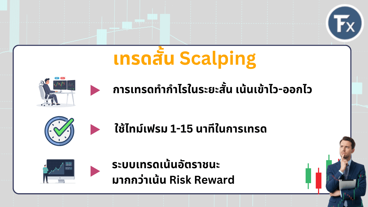 • การเทรด Scalping การเทรดสั้นทำกำไรภายในวัน มีความเสี่ยงสูงเหมาะกับคนมีเวลาเฝ้าหน้าจอ