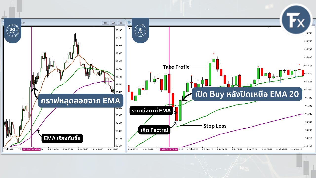 ตัวอย่างการหาจุดเข้า Buy ด้วยกลยุทธ์ EMA และ Fractal