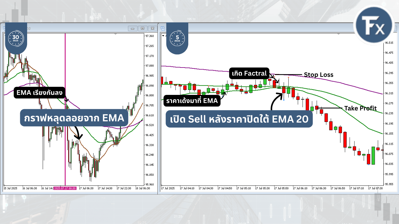 ตัวอย่างการหาจุดเข้า Sell ด้วยกลยุทธ์ EMA และ Fractal