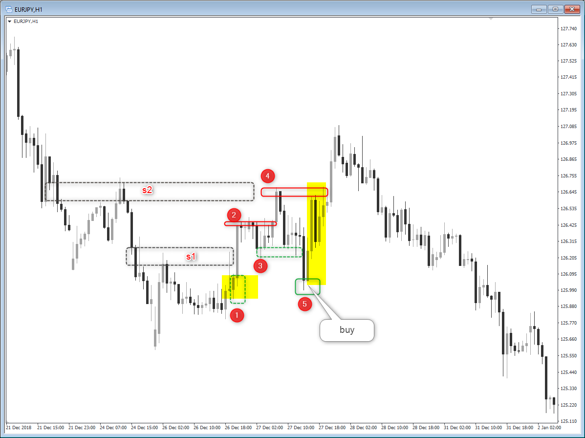 เริ่มจากเลข 1 ที่เป็น demand ใหม่ที่เกิดขึ้น เราก็ตีกรอบเป็นพี้นที่ที่ราคาขึ้นแรงและและปิดแทบ high ของบาร์และปิดเหนือกว่า supply s1 ด้วยบ่งบอกว่าเป็นการเข้าเทรดจริง ราคา sideway ลงมาหน่อยและขึ้นไปทำ new high ที่เลข 4 ตรงที่เป็นพื้นที่ supply s2 อีกตัวถัดมาราคาเริ่มลง การวิ่งของราคาจากเลข 1 -4 เป็นข้อมูลในการกำหนด risk:reward เราก็ตีกรอบ demand base ได้กรอบที่เลข 1 และระยะที่ราคาวิ่งไปถึงเลข 4 เทียบสัดส่วนกรอบทั้งสองเลขน่าจะประมาณ 1:4 ก็ถือว่าเป็นจุดที่พอจะเทรดได้ แล้วมาดูราคาวิ่งลงหาจุดที่จะเทรดคือ buy ที่เลข 5 ราคามาหยุดที่เลข 3 ก่อน แล้วเบรกลงมาใช้ stop เพื่อเข้าหา buy limit ที่จุดเลข 5 และจุดที่ 2 เป็นการกลับมาครั้งแรก สัมพันธกับ momentum ล่าสุด เลยเป็นจุดที่ดึงดูดเทรดเดอร์อื่นๆ ที่รอเข้าตลาดด้วย ราคาขึ้นมาเกินกรอบเลข 3 และไปเทสที่ เลข 4 เป็นการกลับมาครั้งที่ 2 ราคาสามารถวิ่งถึงจุด reward ตามที่บอกแบบง่ายๆ