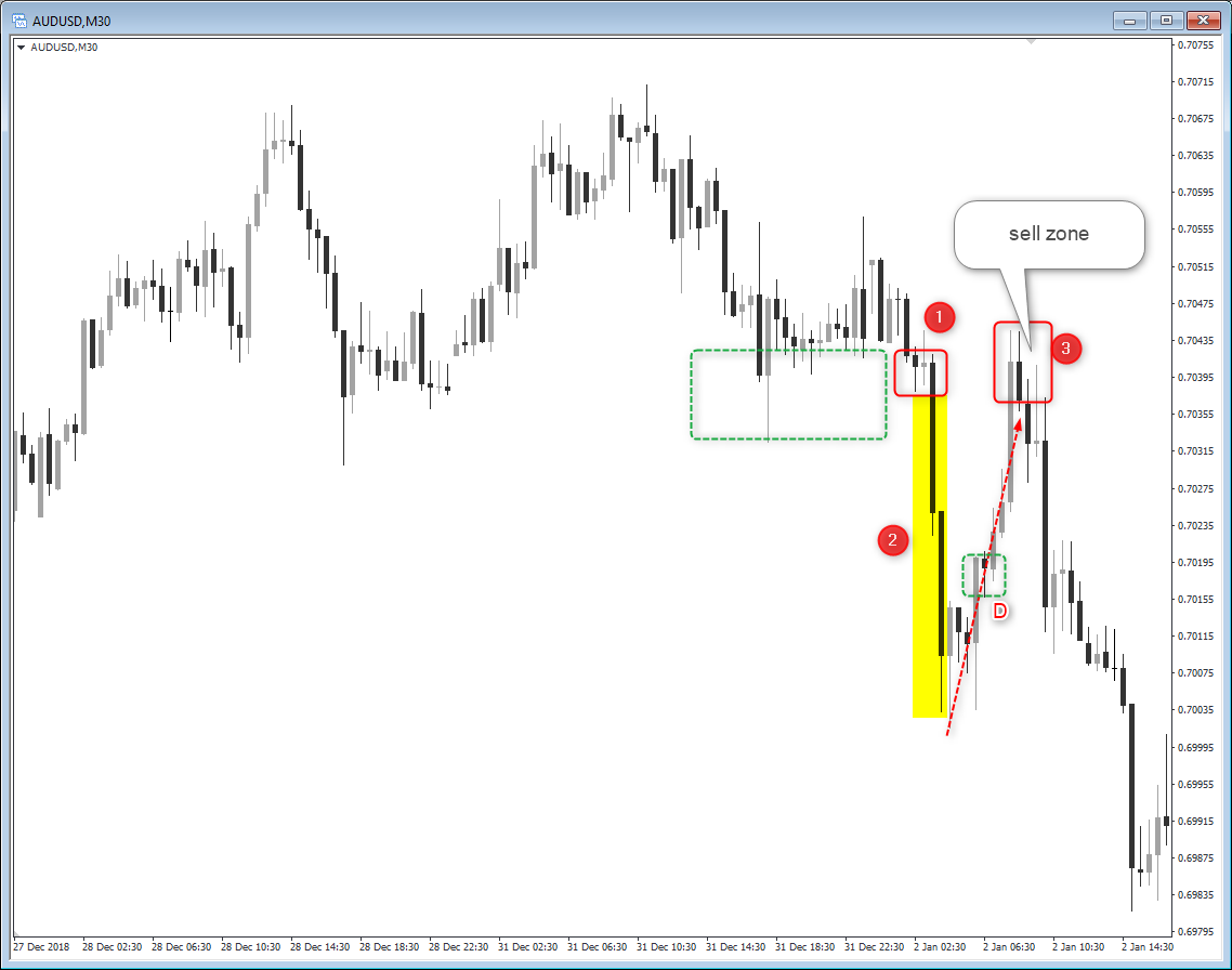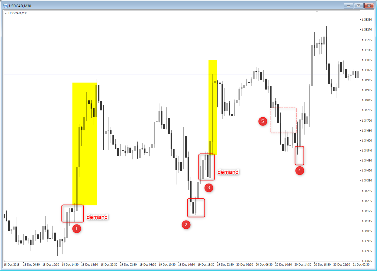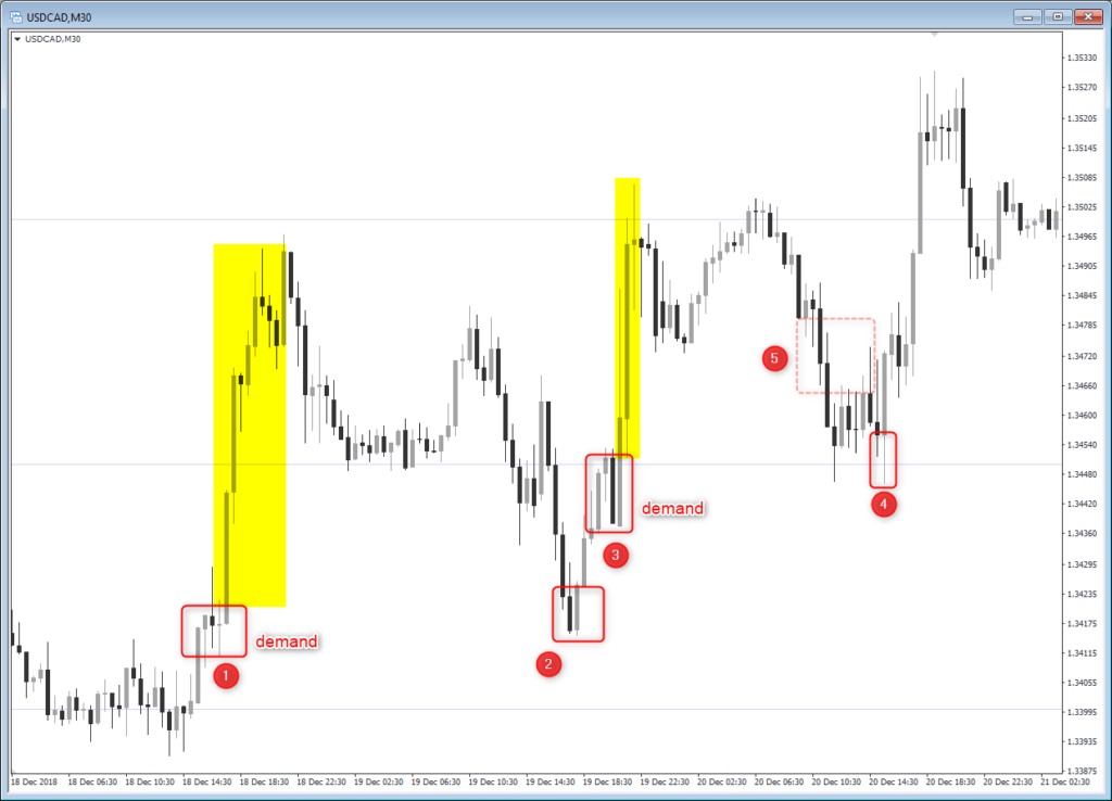 Demand ที่ เลข 3 แม้เกิดหลังจากราคาเด้งจากจุดเข้าเทรดที่เลข 2 แต่การวิ่งของราคาน่าสนใจเพราะบาร์ยาวๆ 2 บาร์ โดยบาร์แรกจะแทงหางยาวๆ ไปเพื่อลด liquidity และเป็นการเทรดไปด้วยในตัว บาร์ 2 ปิดบนด้านช้ายมือได้บอกนัยสำคัญ น่าจะเป็นจุดอ้างอิงในการเข้าเทรดอีกรอบถ้าราคาเปิดเผย พอราคาลงมา ถึงจุด sidewady สักระยะ จนกว่า 2 บาร์ ในกรอบเลข 4 เปิดเผยว่าเข้าเทรดอีก เป็นจังหวะที่สามารถเปิดเทรดด้วยความเป็นไปได้สูง อย่างที่ยกตัวอย่างมาจะเห็นได้ชัดคือโอกาสความเป็นไปได้สูงจะเกิดเมื่อเห็น momentum หรือการเทรดเข้าตลาดจริงที่ไม่ไกลนัก ดูให้ออกว่าการเทรดนั้นเป็นการเปิดเพื่อเข้าตลาดไม่ใช่เพื่อออกจากตลาด ขาใหญ่จะสร้างโครงสร้างที่มี trapped traders ให้เอง เพราะเขาต้องการออเดอร์ที่จะมาเร่งราคาเมื่อตลาดขยับจริงๆ